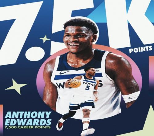 爱德华兹生涯总得分突破7500&历史第三年轻仅次于詹姆斯和杜兰特