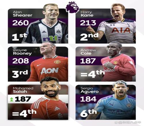 鲁尼 (Wayne Rooney) 国籍:英格兰 俱乐部:曼联 进球数:208球 科尔 (Andrew Cole) 国籍:英格兰 俱乐部:曼联 进球数:187球 萨拉赫 (Mohamed Salah) 国籍:埃及 俱乐部:利物浦 进球数:187球 阿圭罗 (Sergio Agüero) 国籍:阿根廷 俱乐部:曼城 进球数:184球