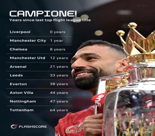 球队距离上次获得顶级联赛冠军的年数 利物浦 0年 曼城 1年 切尔西 8年 曼联 12年 阿森纳 21年 利兹联 33年 埃弗顿 38年 阿斯顿维拉 44年 诺丁汉森林 47年 托特纳姆热刺 64年 伯恩利 65年 狼队 66年 桑德兰 89年 纽卡斯尔联 98年 伯恩茅斯 从未夺冠 布伦特福德 从未夺冠 布莱顿 从未夺冠 水晶宫 从未夺冠 富勒姆 从未夺冠 西汉姆联 从未夺冠