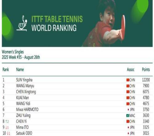 新华社北京8月26日消息,在国际乒联26日公布的最新一期世界排名中,凭借在世界乒乓球职业大联盟(WTT)欧洲大满贯赛瑞典站夺冠收获的2000分,中国队选手孙颖莎的世界排名积分增至12200分,再次刷新由其保持的现行世界排名体系下的积分纪录。 国际乒联于2022年应用新的世界排名规则,运动员的世界排名积分由过去12个月内取得的八站最高积分之和组成。此前她保持的纪录为11900分。 孙颖莎与队友王曼昱、陈幸同、蒯曼、王艺迪位列女单世界前五。日本选手张本美和、中国澳门队朱雨玲分列第六和第七。凭借在欧洲大满贯赛瑞典站闯入四强的表现,另一位国乒队员陈熠排名上升两位,位列第八,刷新个人职业生涯排名新高。日本选手伊藤美诚和大藤沙月分列第九和第十。 男单方面,国乒选手林诗栋和王楚钦占据前两位,身后是日本选手张本智和以及巴西运动员卡尔德拉诺。欧洲大满贯赛瑞典站冠军莫雷加德排名升至第五。排名第六至第十的分别是梁靖崑(中国)、费利克斯·勒布伦(法国)、杜达(德国)、向鹏(中国)、约奇克(斯洛文尼亚)。 中国队组合王曼昱/蒯曼领跑女双,林诗栋/蒯曼在混双项目上高居榜首,男双世界第一为法国的勒布伦兄弟。 来源:新华社 |