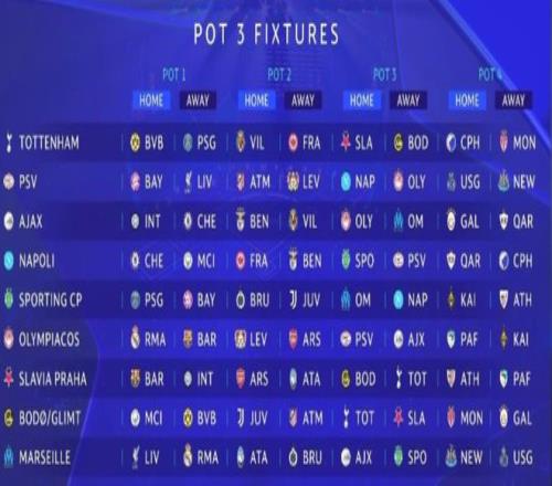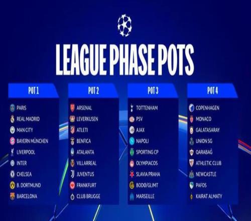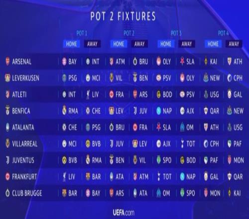 北京时间8月29日凌晨,2025-26赛季欧冠联赛阶段的抽签结果正式出炉,36支球队各自在联赛阶段的8个对手,以及主客场对阵已经全部确定,多场“强强对话”将如期上演。 【第一档球队】 巴黎圣日耳曼(卫冕冠军):拜仁(主)、巴萨(客)、亚特兰大(主)、勒沃库森(客)、热刺(主)、葡体(客)、纽卡(主)、毕巴(客) 【第二档球队】 阿森纳:拜仁(主)、国米(客)、马竞(主)、布鲁日(客)、奥林匹亚科斯(主)、布拉格斯拉维亚(客)、阿拉木图凯拉特(主)、毕巴(客) 勒沃库森:巴黎(主)、曼城(客)、黄潜(主)、本菲卡(客)、埃因霍温(主)、奥林匹亚科斯(客)、纽卡(主)、哥本哈根(客) 马德里竞技:国米(主)、利物浦(客)、法兰克福(主)、阿森纳(客)、博德闪耀(主)、埃因霍温(客)、圣吉罗斯(主)、加拉塔萨雷(客) 本菲卡:皇马(主)、切尔西(客)、勒沃库森(主)、尤文(客)、那不勒斯(主)、阿贾克斯(客)、卡拉巴赫(主)、纽卡(客) 亚特兰大:切尔西(主)、巴黎(客)、布鲁日(主)、法兰克福(客)、布拉格斯拉维亚(主)、马赛(客)、毕巴(主)、圣吉罗斯(客) 黄潜(比利亚雷亚尔):曼城(主)、多特(客)、尤文(主)、勒沃库森(客)、阿贾克斯(主)、热刺(客)、哥本哈根(主)、帕福斯(客) 尤文图斯:多特(主)、皇马(客)、本菲卡(主)、黄潜(客)、葡体(主)、博德闪耀(客)、帕福斯(主)、摩纳哥(客) 法兰克福:利物浦(主)、巴萨(客)、亚特兰大(主)、马竞(客)、热刺(主)、那不勒斯(客)、加拉塔萨雷(主)、卡拉巴赫(客) 布鲁日:巴萨(主)、拜仁(客)、阿森纳(主)、亚特兰大(客)、马赛(主)、葡体(客)、摩纳哥(主)、阿拉木图凯拉特(客) 【第三档球队】 托特纳姆热刺:多特(主)、巴黎(客)、黄潜(主)、法兰克福(客)、布拉格斯拉维亚(主)、博德闪耀(客)、哥本哈根(主)、摩纳哥(客) PSV埃因霍温:拜仁(主)、利物浦(客)、马竞(主)、勒沃库森(客)、那不勒斯(主)、奥林匹亚科斯(客)、圣吉罗斯(主)、纽卡(客) 阿贾克斯:国米(主)、切尔西(客)、本菲卡(主)、黄潜(客)、奥林匹亚科斯(主)、马赛(客)、加拉塔萨雷(主)、卡拉巴赫(客) 那不勒斯:切尔西(主)、曼城(客)、法兰克福(主)、本菲卡(客)、葡体(主)、埃因霍温(客)、卡拉巴赫(主)、哥本哈根(客) 葡萄牙体育:巴黎(主)、拜仁(客)、布鲁日(主)、尤文(客)、马赛(主)、那不勒斯(客)、阿拉木图凯拉特(主)、毕巴(客) 奥林匹亚科斯:皇马(主)、巴萨(客)、勒沃库森(主)、阿森纳(客)、埃因霍温(主)、阿贾克斯(客)、帕福斯(主)、阿拉木图凯拉特(客) 布拉格斯拉维亚:巴萨(主)、国米(客)、阿森纳(主)、亚特兰大(客)、博德闪耀(主)、热刺(客)、毕巴(主)、帕福斯(客) 博德闪耀:曼城(主)、多特(客)、尤文(主)、马竞(客)、热刺(主)、布拉格斯拉维亚(客)、摩纳哥(主)、加拉塔萨雷(客) 马赛:利物浦(主)、皇马(客)、亚特兰大(主)、布鲁日(客)、阿贾克斯(主)、葡体(客)、纽卡(主)、圣吉罗斯(客) 【第四档球队】 毕尔巴鄂竞技:巴黎(主)、多特(客)、阿森纳(主)、亚特兰大(客)、葡体(主)、布拉格斯拉维亚(客)、卡拉巴赫(主)、纽卡(客) 卡拉巴赫:切尔西(主)、利物浦(客)、法兰克福(主)、本菲卡(客)、阿贾克斯(主)、那不勒斯(客)、哥本哈根(主)、毕巴(客) 摩纳哥:曼城(主)、皇马(客)、尤文(主)、布鲁日(客)、热刺(主)、博德闪耀(客)、加拉塔萨雷(主)、帕福斯(客) 加拉塔萨雷:利物浦(主)、曼城(客)、马竞(主)、法兰克福(客)、博德闪耀(主)、阿贾克斯(客)、圣吉罗斯(主)、 纽卡斯尔联:巴萨(主)、巴黎(客)、本菲卡(主)、勒沃库森(客)、埃因霍温(主)、马赛(客)、毕巴(主)、圣吉罗斯(客) 哥本哈根:多特(主)、巴萨(客)、勒沃库森(主)、黄潜(客)、那不勒斯(主)、热刺(客)、阿拉木图凯拉特(主)、卡拉巴赫(客) 圣吉罗斯联合:国米(主)、拜仁(客)、亚特兰大(主)、马竞(客)、马赛(主)、埃因霍温(客)、纽卡(主)、加拉塔萨雷(客) 帕福斯:拜仁(主)、切尔西(客)、黄潜(主)、尤文(客)、布拉格斯拉维亚(主)、奥林匹亚科斯(客)、摩纳哥(主)、阿拉木图凯拉特(客) 阿拉木图凯拉特:皇马(主)、国米(客)、布鲁日(主)、阿森纳(客)、奥林匹亚科斯(主)、葡体(客)、帕福斯(主)、哥本哈根(客) 【欧冠赛制】 这是欧冠赛制改革后的第2个赛季,在全新的联赛阶段中,每支球队都将根据抽签从4个档位分别选出2个共计8个不同对手,进行4主4客共计8场比赛。 36支球队将统一进行排名,其中联赛阶段排名前8名的球队将自动晋级16强,第9至24名将进行两回合附加赛,争夺剩余8个十六强名额。 排名第25名及以下的球队将会被淘汰,无法参加欧联杯等其他欧战比赛。从16强淘汰赛开始,比赛将延续旧有的淘汰赛赛制。 【欧冠赛程】 第1轮:2025年9月16–18日 第2轮:2025年9月30日–10月1日 第3轮:2025年10月21-22日 第4轮:2025年11月4-5日 第5轮:2025年11月25-26日 第6轮:2025年12月9-10日 第7轮:2026年1月20-21日 第8轮:2026年1月28日 2025-26赛季欧冠淘汰赛时间: 淘汰赛附加赛:2026年2月17-18日 & 2月24-25日 1/8决赛:2026年3月10-11日 & 3月17-18日 1/4决赛:2026年4月7-8日 & 4月14-15日 半决赛:2026年4月28-29日 & 5月5-6日 决赛:2026年5月30日(布达佩斯普斯卡什竞技场) 2025-26赛季抽签时间: 淘汰赛附加赛:2026年1月30日 1/8决赛、1/4决赛、半决赛和决赛:2026年2月27日 |