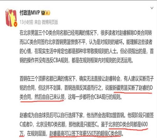 据悉,新疆男篮提前终止了赵睿还剩下1年的D类合同,随后北京与后者签下了一份为期3年的C类合同,这样一来北京男篮的三名顶薪球员均得以留队(周琦、范子铭、陈盈骏)。考虑到大C类合同的极限与D类顶薪就只差50万,像赵睿这种级别的国手,大概率能拿到满额550万的C类合同,而剩下的50万,按照北京队的战绩,在常规赛多赢几场比赛,赢球奖金绝对可以填上那50万的窟窿。