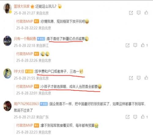 随后媒体人付政浩也发文谈到了赵睿加盟北京的交易,并且表示北京方面祭出满满的诚意,而新疆深谙“强扭的瓜不甜”的道理,只能选择尊重赵睿本人意愿。有网友也在评论区写道:“签字费、户口、房子三选一”,而付政浩则是回复:“小孩子才做选择题,成年人当然是全都要。”另外也有网友表示在满满的诚意面前,顶薪只是零花钱,付政浩也回复:“你悟了。”