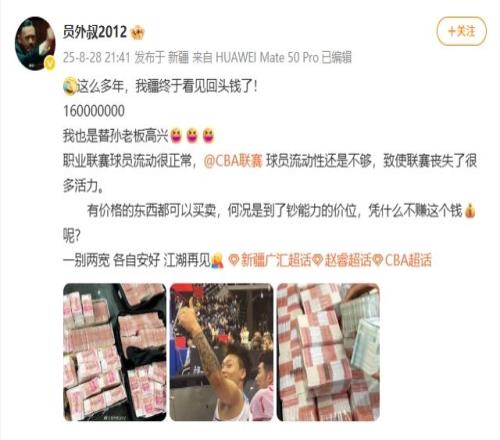 此外,新疆博主员外叔也晒出赵睿和一堆钞票的图片,透露新疆在赵睿的交易中拿到了1.6亿人民币。虽然暂不知晓这则消息的真实性,但考虑到此前引进周琦就花了超过5000万,刚刚在亚洲杯上证明了自己的赵睿,此番能让新疆这样的土豪球队放手,费用与周琦相比,绝对只高不少。
