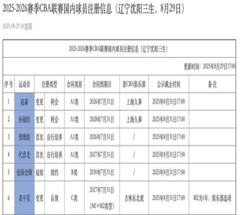 雷速体育8月29日讯 CBA官方今日更新了辽宁男篮的球员注册信息,和上期相比新增了6名球员。