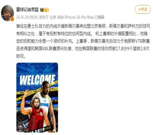 在此前已经有媒体人爆料,表示斯佩尔曼有望加盟一支CBA的北方俱乐部球队。如今贾磊报道是加盟北京男篮,对于“财大气粗”的北京男篮而言,如此引援并不令人意外。 北京男篮上赛季时隔10年重返总决赛,却遗憾在总决赛总分2-4输给广厦男篮丢冠。北京男篮新赛季致力于重新冲冠,根据此前报道他们引进中国男篮队长赵睿,且是以3年C类合同签约,保留了此前的3位顶薪球员周琦、陈盈骏与范子铭。