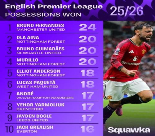 新赛季英超赢得球权榜:B费24次居首布鲁诺&帕奎塔&格拉利什在列