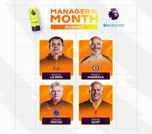 雷速体育9月4日宣 今天英超官方公布了8月联赛最佳教练候选,斯洛特、马雷斯卡领衔。 四名候选人分别为: 勒布理斯(桑德兰),球队战绩2胜1负; 马雷斯卡(切尔西),战绩2胜1平; 莫耶斯(西汉姆联),战绩1胜2负; 斯洛特(利物浦),战绩3胜。 |