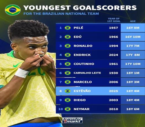 18岁4个月,埃斯特旺成为巴西队历史上第八年轻的进球队员