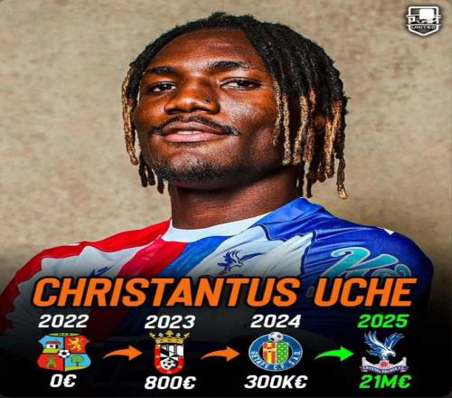 2023年夏天,一支位于北非大陆的西班牙第三级别球队从一支名不见经传的西班牙第五级别球队签下了一位名不见经传的尼日利亚球员,转会费800欧,没有“万”。换算成人民币,这笔转会费还不到7000块,如果将这名球员比作是一款藏品,那么两年后的现在,他的价值已经达到了1750万欧,升值21875倍! 这位制造足坛罕见的爆炸升值的“藏品”,就是22岁的尼日利亚前锋,水晶宫的新援,赫塔费主帅博尔达拉斯的得意力作——克里桑图斯-乌切。今年夏窗最后时刻,水晶宫以租借+强制买断的方式从赫塔费签下了乌切,买断费用1750万欧。 两年内,乌切的转会费从800欧来到1750万欧;一年里,乌切的转会市场身价从40万欧来到1500万欧。这就是克里桑图斯-乌切的草根奇迹。 如果我们把乌切的履历打印成简历,那么一页纸也就够了: 姓名:克里桑图斯-乌切 籍贯:尼日利亚 出生日期:2003年5月19日 身高:1米90 求职意向:后卫、后腰、前腰、边锋、前锋 工作履历: ①2022年,尼日利亚业余俱乐部坎波斯,职务:后卫 ②2022-23赛季,西班牙第五级别球队莫拉罗,职务:后卫/后腰 ③2023-24赛季,西班牙第三级别球队休达,职务:后腰/中前卫 ④2024-25赛季,西甲球队赫塔费,职务:前腰/中锋 ⑤2025-26赛季,英超球队水晶宫,职务:前锋 其实到现在,除了西甲球迷,很多球迷对乌切并不太了解。但我们只需要知道,有一名来自非洲的草根球员,他用两年时间踢上了西甲,两年内转会费从800欧到了1750万欧,这串数字本身就是一个奇迹。 如果我们把乌切的故事拍成电影,那么这部电影的宣传片,应该播放的就是发生在2024年8月15日,圣马梅斯球场的那一幕。 那是24-25赛季西甲的第一场比赛,赫塔费主帅博尔达拉斯因注册问题只有15名一线队球员,没有中锋可用。于是,博尔达拉斯用一个俱乐部刚从西协甲花50万欧签下的后腰代打中锋。 第64分钟,身穿6号球衣的乌切在禁区前高高跃起,甩头攻门,为赫塔费1-1扳平比分! 在毕尔巴鄂竞技的圣马梅斯球场,21岁的乌切上演了一鸣惊人的剧本。一个从低级别联赛加盟的后腰,首秀客串中锋攻入扳平进球,还赢得了9次对抗,抢回3次球权,制造4次犯规。这是一个多么梦幻的开局? 西班牙六台的评论员Alfredo Duro惊叹:“我今天是去看尼科-威廉斯的,却成了乌切的球迷,从休达来到赫塔费的乌切,他去年还在踢第三级别联赛,如今成为了圣马梅斯的英雄!” “他非常出色,他是一个非常无私的小伙子,他有几次精彩的跑动……他的表现非常出色。”博尔达拉斯在乌切首秀后就对他赞不绝口,当初,博尔达拉斯看中的正是乌切出色的身体素质和强大的覆盖能力。博尔达拉斯知道,这笔转会赌赢了! 西班牙《马卡报》用“两年内从尼日利亚的泥土球场到圣马梅斯球场进球”为标题介绍了乌切的经历,《阿斯报》的标题则是“从泥地球场到西甲新宠”。正是从这一刻起,乌切的神奇履历才被徐徐揭开。 足球世界的版图里,非洲大陆一直是一块散落着黄金的神秘土地,一个个欧洲足坛的球探如同淘金者,前赴后继,在这里寻找着有潜力的足球天才。 这是乌切在非洲的泥地上踢球的景象,这一幕就发生在三年前。当时的乌切19岁,在球场上担任后卫。乌切身高1米90,在后场有着无可撼动的制空权,从短暂的集锦里,我们可以看到乌切的侵略性,他的大局观,还有一脚精准的长传。在球队的后场,他不仅是一道大闸,还可以扮演发牌机的角色,简单说,他是一个既有身高、又有脚下的后场核心。 乌切出生在尼日利亚的奥韦里,当时他效力于一家名叫坎波斯的俱乐部,这已经是他在当地效力的第三家俱乐部。在坎波斯,乌切被球探发现了。 两年后,在西甲成名的乌切接受了DAZN体育频道的采访,回顾了他在尼日利亚的生活。 “在尼日利亚的生活太艰难了,如果我现在审视自己……回首过去,会发现变化真的很大。每天我都感谢上帝赐予我这样的生活。在尼日利亚,每个人都热爱足球,每个人都想踢球,尤其是当他们看到有个男孩实现了自己的梦想,实现了自己的事业……他们就会受到激励,会更想踢球。” 在家乡奥韦里,乌切踢着村子里的业余足球,由于负担不起费用,他无法进入任何足球学院。直到,他被西班牙的球探发现。 2022年7月,乌切来到了纳瓦尔莫拉尔镇的莫拉罗俱乐部,随俱乐部的B队在第六级别联赛踢球。在出场7次攻入1球后,2023年1月,乌切被调入一线队,随俱乐部征战西协丙(第五级别)。2023年3月12日,在十几名观众的见证下,乌切完成了加盟俱乐部后一线队的首秀。 2023年夏天,西协甲俱乐部休达(位于西班牙在北非摩洛哥北部的飞地)以800欧转会费签下了乌切。而不到一年半,乌切就登上了西甲赛场。2024年10月,乌切重返莫拉罗俱乐部,拜访了管理层和俱乐部,并为小球迷签名。俱乐部主席奥拉西奥-戈麦斯评价他:“他很有礼貌,也很勤奋。他已经融入了小镇,人们爱他,他们把他视为偶像。” 乌切被莫拉罗俱乐部视作骄傲,他为俱乐部贡献的不仅是榜样作用。当他从赫塔费加盟水晶宫,休达保留了他12.5%的转会分成,而莫拉罗则保留了7.5%。这也就意味着在水晶宫正式买断乌切后,这家小镇俱乐部可以拿到一笔131.25万欧元的巨额分成! 在乌切的崛起之路上,莫拉罗、休达、赫塔费都成为了经济上的直接受益者。这不仅是一个草根逆袭的奇迹,也是一个个商业奇迹、投资奇迹。 当乌切加盟休达,休达俱乐部的体育总监和主教练很