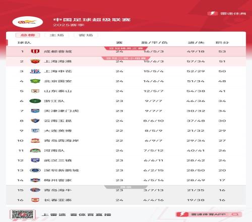 中超最新积分榜:蓉城53分领跑,国安两连败48分第四