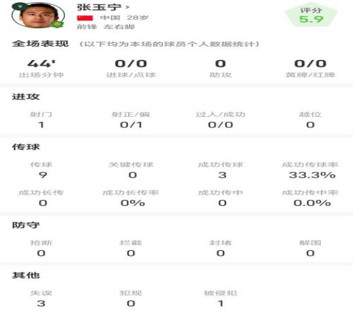 张玉宁vs河南队全场数据:传球成功率33.3%,失误3次