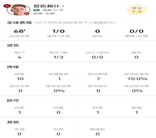 哲凯赖什vs森林数据:4射1正进1球,1次抢断1次解围