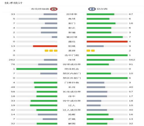 第5分钟,博纳诺特横传,佩德罗打门被防守球员封堵 第6分钟,沙德禁区内抽射,皮球被阿达拉比奥尤封堵 第8分钟,蒂亚戈拉拽查洛巴,裁判出示黄牌 第13分钟,内托任意球开出,阿达拉比奥尤头球被没收 第19分钟,查洛巴精准长传,可惜内托未能处理好 第30分钟,哈托放倒蒂亚戈,裁判出示黄牌 第35分钟,亨德森助攻,沙德长途奔袭冷静推射破门,切尔西0-1落后 第41分钟,查洛巴外围远射,皮球打高了 第43分钟,吉滕斯内切兜射,皮球被门将没收 第45分钟,博纳诺特传球,恩佐禁区内打门稍稍偏出 第51分钟,乔治小角度劲射,门将将球扑出 第54分钟,吉滕斯传球,库库雷利亚抽射被门将没收 第56分钟,吉滕斯被换下,帕尔默替补登场 第61分钟,寒王!恩佐传向禁区,帕尔默凌空抽射破门,切尔西1-1扳平 第64分钟,亚尔莫柳克放倒帕尔默,裁判出示黄牌 第67分钟,恩佐长传,内托内切打门被平诺克封堵 第75分钟,内托横传中路,帕尔默推射被门将没收 第79分钟,佩德罗被换下,加纳乔替补登场 第85分钟,反超比分!加纳乔横传中路,凯塞多抽射破门,切尔西2-1领先 上咪咕独家看英超 第88分钟,大力手抛球掷向门前,桑切斯将球扑出 第90+3分钟,绝平,卡瓦略后点推射破门,布伦特福德2-2切尔西