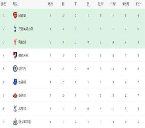 在积分榜上,阿森纳以9分占据榜首位置。热刺、利物浦和伯恩茅斯也都是9分。不过,利物浦只踢了3场。切尔西以8分排名第5。埃弗顿和桑德兰都是7分,排名第6和第7名。曼联4分排名第11。曼城3分排名第16。 |