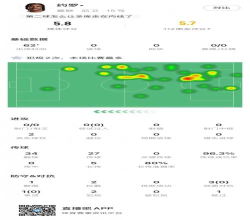 约罗本场数据:1解围,2拦截,传球成功率96.3%,评分5.8