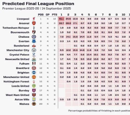 北京时间9月15日凌晨,在英超第4轮的曼市德比中,曼联客场 0-3 完败于曼城,惨遭同城死敌横扫。新赛季四轮联赛战罢,曼联仅取得 1 胜 1 平 2 负的战绩,目前积 4 分,在英超积分榜上排名第 14 位。 据超级计算机计算,曼联本赛季降级的概率已攀升至 11%。而球队打入联赛前 5 的概率仅为 7.3%,至于夺得联赛冠军的概率更是低至 0.2%。曼联上一次夺得英超冠军还是在 2012-13 赛季,如今球队却陷入这般困境,着实令人唏嘘。 |