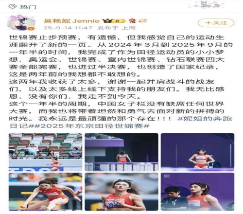 澎湃新闻 综合报道 9月14日上午,2025年东京田径世锦赛女子100米栏预赛, 吴艳妮第一组第9道登场,最终以13秒12的成绩获得小 组第五, 无缘半决赛。 赛后采访中,吴艳妮表示:“肯定不满意,没有跑出来,发命令的时候我旁边的选手差点抢跑了,她一闪我也闪了一下,正好我回来的时候发令枪响了,起跑反应0.293秒,有史以来最慢的一次,没关系吧,已经比完了,我也不想去想了,后面在日照的比赛,把强度提一提,这一次世锦赛的感受,跟奥运会差不多,这一次状态比奥运会好,但是没跑出理想的成绩,希望大家再给我点时间。” 随后,吴艳妮发文称,世锦赛止步预赛,有遗憾,但我感觉自己的运动生涯翻开了新的一页。从2024年3月到2025年9月的一年半的时间,我完成了作为田 径运动员的小小梦想,奥运会、世锦赛、室内世锦赛、钻石联赛四大赛全部完赛,也进过半决赛,也创造了国家纪录,这是两年前的我想都不敢想的。 这两年我收获了太多,谢谢一起并肩战斗的战友们,以及太多线上线下支持我的朋友们。我无比感恩,没有你们,我走不到今天。 (综合自 澎湃新闻记者 马作宇、吴艳妮微博 ) 本 期资深 编 辑 周玉华 |