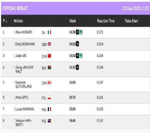 莫家蝶54秒63获小组第三,中国女子400米栏时隔16年再进世锦赛半决赛