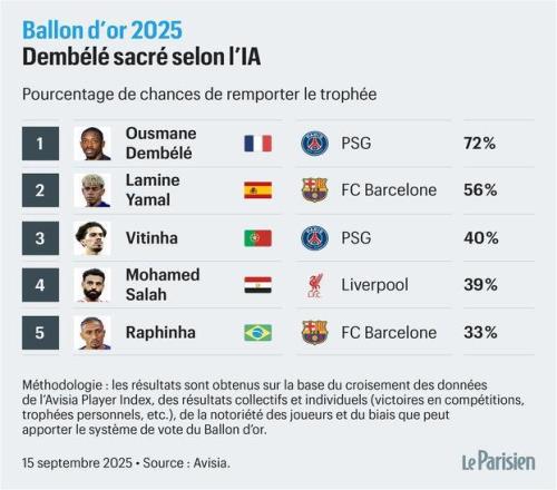 近日,Avisia公司使用人工智能模型预测了今年的金球奖得主。结果显示,巴黎球星登贝莱赢得今年金球奖的概率为72%,巴萨球星亚马尔56%位居次席。