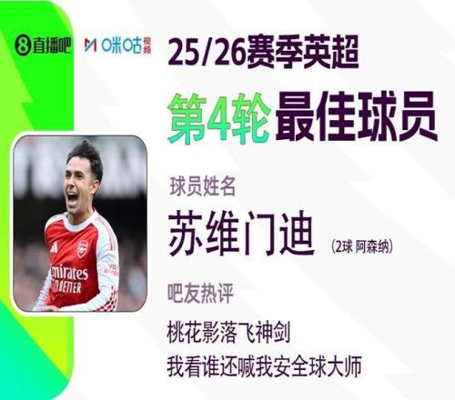 2025-2026赛季英超火热进行中,直播吧和咪咕体育联合发起每轮英超最佳球员评选活动!第四轮评选结果结出炉,苏维门迪头顶脚踢梅开二度,帮助阿森纳3-0大胜诺丁汉森林,获得吧友超14万票的支持,以绝对优势当选 【直播吧X咪咕体育英超第4轮最佳球员】! 直播吧X咪咕体育 英超第4轮MVP评选 阿森纳3-0诺丁汉森林,苏维门迪头顶脚踢梅开二度! 吧友热评:桃花影落飞神剑,我看谁还喊我安全球大师 |