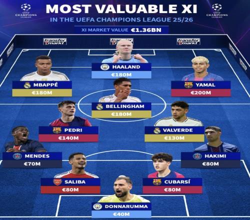 德转列欧冠最贵阵容:姆巴佩、哈兰德、亚马尔领衔锋线