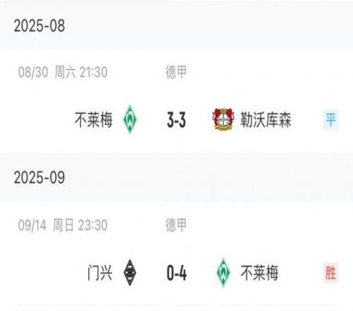不莱梅德甲前三轮1胜1平1负,目前积4分位列德甲第9。