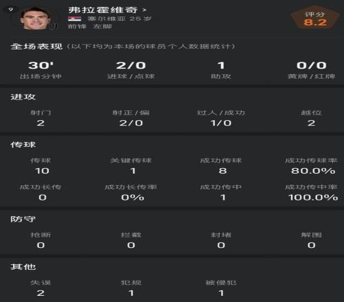 弗拉霍维奇vs多特数据:30分钟造三球,2射正均收获进球