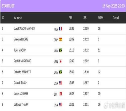 9月16日, 2025年东京田径世锦赛男子110米栏决赛名单出炉:廷奇、村竹拉希德等人入围。决赛将在北京时间今晚9点20分进行。