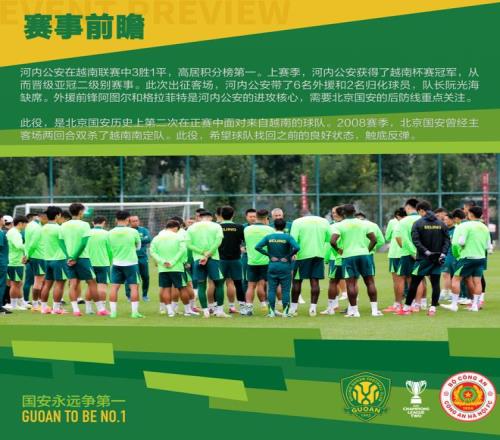 2025-26赛季亚冠二级联赛小组赛 第1轮 北京国安(中国)VS 河内公安(越南) 2025.9.18 20:15 北京工人体育场 /赛前言论/ 今天,主教练塞蒂恩和队长张稀哲出席了赛前新闻发布会。 主教练塞蒂恩在新闻发布会上说:“这是一场很特别的比赛,对手很特别,我们对他们的了解也比较有限。我们之前从来没有遇到过这个对手,希望能打好明天的比赛。对手很有特点,也有很好的阵容班底,我们做好了准备。” 球员张稀哲在发布会上说:“很高兴又回到亚冠赛场,希望明天有一个好的结果。对球员来说每一次出场都是机会,不论谁出场都会全力以赴” 由于本场比赛之后又要面临一场非常重要的中超联赛,对于这种情况,主教练塞蒂恩表示:“北京国安面对每场都会全力争胜,周末比赛当然很重要,因为现在的每一分都很重要。明天的比赛同样很重要,但没有周末那么重要,这是6场比赛的小联赛。当然,两场比赛我们都会全力以赴。” “我不喜欢预测比赛,所有比赛都需要全力以赴。当然,也要根据对手情况进行准备。我们遭遇的失败是前进道路都会经历的,没人会满意我们最近的表现,我自己也不满意。 现在能做的就是努力把丢掉的分数拿回来。现在留给我们的机会并不多。我也告诉所有队员我们8个月以来一直向一个目标努力,过程中会有失败,要想成为伟大球队需要去处理好应对失败,这期间我们需要看到球队的成长。” 谈及球队阵容及伤病情况时,塞蒂恩说:“最近赛程密集我们很多球员出现了疲劳伤病,明天会有轮换。我也希望给努力训练的球员机会,我很伤心看到年轻球员在努力但出场机会不多。明天如果有机会的话,对他们来说是很好的展现自己的方式。每一个球员出场都会尽最大努力,我们很清楚北京国安的未来在他们身上 ,每个人的表现都是很重要的。” 发布会最后,塞蒂恩也展望了球队的亚冠征程,他说:“亚冠赛事会一直持续到明年,在国际赛场的每一个对手都会全力以赴。我们自己会全力争胜,对手也一样。 明天以及以后的比赛都不会容易,我们的目标是在亚冠赛场走得越远越好” /赛事前瞻/ /直播平台/ 爱奇艺体育 咪咕视频、移动高清、咪视界 即可购买北京国安官方授权商品 |
