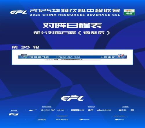 官方:中超第30轮津门虎vs申花调整在天津奥体中心体育场进行