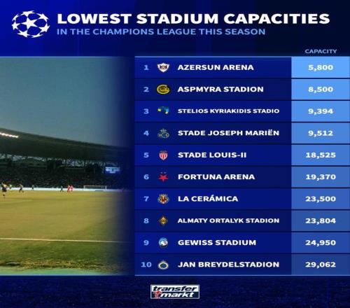 本赛季欧冠球队主场容量排名,伯纳乌球场83186人居榜首