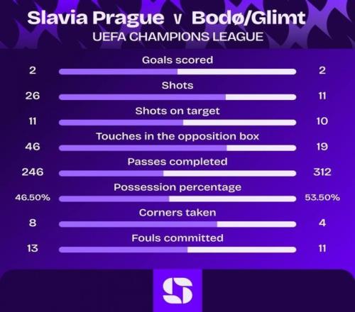布拉格斯拉维亚vs博德闪耀两队均射正10+,近10个赛季欧冠第3次