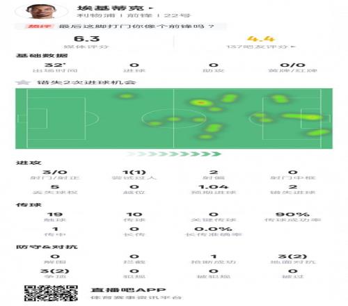 直播吧9月18日宣 欧冠联赛阶段第1轮,利物浦主场3-2马竞。埃基蒂克替补出战,2次错失进球机会,3次射门0射正,评分6.3。