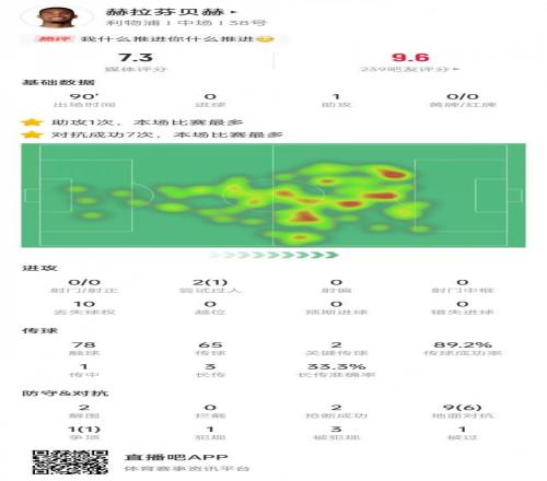 送出助攻+7次对抗成功!赫拉芬贝赫当选本场利物浦队内最佳球员