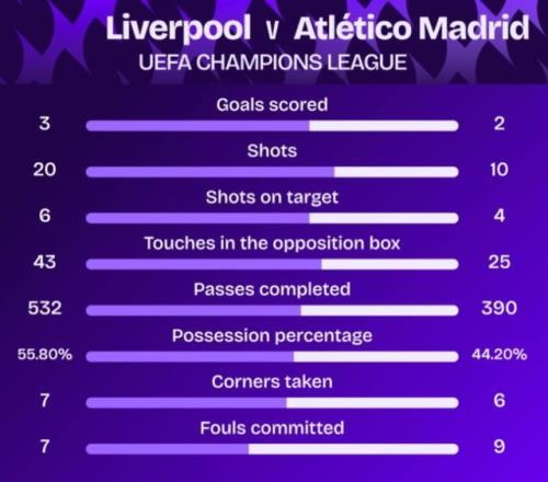 体坛周报全媒体原创 利物浦3比2马德里竞技 4'安迪·罗伯逊,6'萨拉赫,90+2'范戴克/45+3'马科斯·略伦特,81'马科斯·略伦特 欧冠联赛阶段首轮,利物浦坐镇主场迎战开局不顺的马竞。利物浦新援伊萨克首发出场完成首秀。萨拉赫开场6分钟完成传射建功,帮助利物浦打出梦幻开局。马科斯·略伦特梅开二度帮助马竞扳平比分。伤停补时阶段范戴克头球破门完成绝杀,利物浦主场3比2惊险战胜马竞,取得新赛季各项赛事五连胜。 开场第4分钟,萨拉赫主罚禁区前沿的直接任意球,打在安迪·罗伯逊的身上弹进球门。利物浦在主场闪电取得领先。 第6分钟,萨拉赫与赫拉芬贝赫在肋部打出精妙配合后左脚推射远角得手。利物浦迅速扩大领先优势。 上半场伤停补时,拉斯帕多里反越位成功,禁区内送出横传,马科斯·略伦特捅射将球打进。马竞扳回一城。 第65分钟,利物浦反击以多打少,空位无人干扰的萨拉赫击中立柱。 第81分钟,马科斯·略伦特弧顶处凌空抽射,皮球折射后飞入球门。马竞扳平比分。 第85分钟,索博斯洛伊开出角球,科纳特头球偏出球门。 伤停补时第2分钟,索博斯洛伊开出角球,范戴克点球点附近高高跃起头球破门。利物浦完成绝杀。进球后,西蒙尼因为对裁判表示不满而被直接红牌罚出场外。 比赛最后时刻,萨拉赫传中,门前无人盯防的埃基蒂克将球打高。 利物浦首发:阿利松/杰里米·弗林蓬(58'康纳·布拉德利),科纳特,范戴克,安迪·罗伯逊(86'凯尔凯兹)/索博斯洛伊,赫拉芬贝赫/萨拉赫,维尔茨(74'恩古莫哈),哈克波(58'麦卡利斯特)/伊萨克(58'埃基蒂克) 马竞首发:奥布拉克/马科斯·略伦特,勒诺尔芒,朗格莱,加兰/朱利亚诺·西蒙尼,巴勃罗·巴里奥斯,加拉格尔(61'纳韦尔·莫利纳),尼古拉斯·冈萨雷斯(77'普维尔)/拉斯帕多里(52'科克),格列兹曼(61'瑟洛特) 【数说】 500-奥布拉克迎来自己在马竞的第500次出场,是马竞队史首位达到这一里程碑的门将。 1-加拉格尔是继2006年代表皇马出战阿森纳以来第一次有英格兰球员代表非英格兰俱乐部在欧冠中面对英格兰球队。 6-马竞队史首次在欧冠比赛中开场6分钟就丢掉2球。 6-萨拉赫是欧冠历史上第一位代表英格兰球队在开场6分钟内完成传射的球员。 4-马科斯略伦特在安菲尔德打入4球,占到他所有欧冠进球(7球)的一半以上。他也和本泽马并列成为欧冠历史上在安菲尔德面对利物浦进球最多的球员。 5-利物浦新赛季开局连续5场比赛依靠比赛最后十分钟的进球取得胜利。 文/刘璃 |