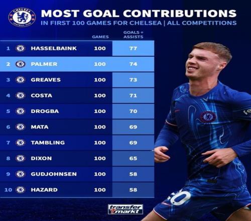 切尔西球员百场造进球数据:帕尔默74球队史第二