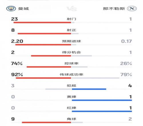 碾压局!曼城20那不勒斯数据:射门231,射正81,角球92