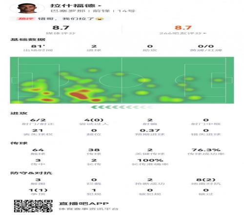 直播吧9月19日宣 欧冠首轮,巴萨2-0客场领先纽卡斯尔。此役拉什福德首发81分钟被换下,球员全场重点数据如下↓