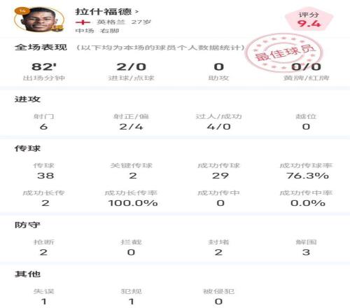 梅开二度!拉什福德全场数据:6射2正进2球,2次关键传球