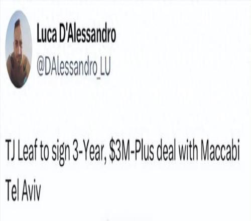 据外媒报道,TJ-利夫与马卡比特尔亚夫俱乐部签订一份为期三年,价值超过300万美元的合同,全额保障。