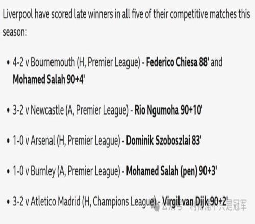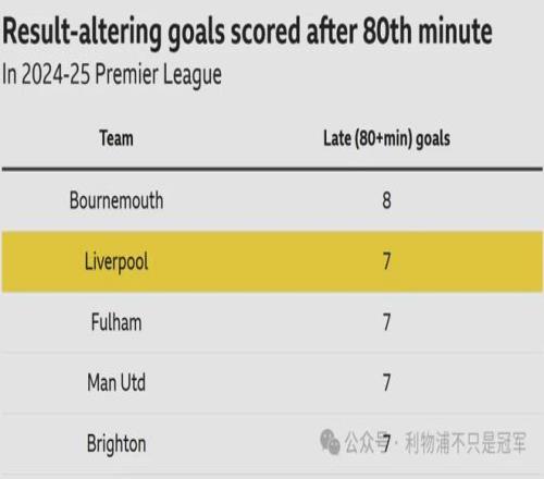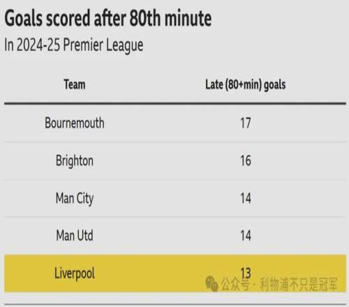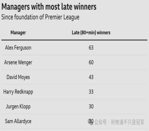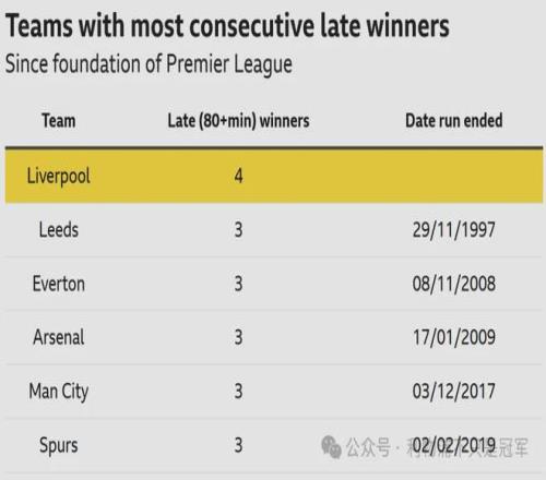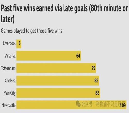 完成5场最后10分钟绝杀,利物浦用了5场,阿森纳用了64场
