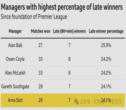 分享一组权威数据机构OPTA关于利物浦绝杀的数据统计: --利物浦的制胜球进球时间,本赛季5场平均是在91分钟;而上赛季利物浦只净胜一球的比赛中,打进制胜球的平均时间是70分钟。 --上赛季利物浦在英超和欧冠的48场比赛中,只在伤停补时阶段打进4球,其中2个都是在对布伦特福的同一场比赛中。 --上赛季利物浦在英超80分钟以后的进球一共13个,有4支球队比利物浦更多(伯恩茅斯、布莱顿、曼城、曼联)。 --上赛季利物浦在英超80分钟以后,改变最终比赛结果的进球一共7个,与富勒姆、曼联、布莱顿并列,比伯恩茅斯少一个。 --英超本赛季参加欧冠的6支球队,最近完成5次80分钟以后的制胜球绝杀,利物浦用了5场比赛(时间跨度32天),阿森纳用了64场(时间跨度16个月)、热刺79场、切尔西82场、曼城83场、纽卡109场。 --利物浦在英超连续4场最后时刻(80分钟以后)绝杀,已经创造了英超历史纪录,此前纪录是利兹联、埃弗顿、阿森纳、曼城和热刺共同保持的连续3场。 --斯洛特目前在英超一共拿到29场胜利,其中有7场是80分钟以后绝杀,占比24.1%,在所有至少拿到25胜的英超主帅中,这个比例可以排名第5。 --但如果统计80分钟以后绝杀次数最多的主帅,那还是弗格森一共63场,其次是温格60场,克洛普30场排名第五。但弗格森的曼联,连续80分钟以后绝杀的英超比赛,也只不过是连续2场,但有4次做到(连续2场80分钟以后绝杀)。 --如果统计英超90分钟以后的绝杀,利物浦47次排名第一,阿森纳34次曼联33次排名二三。 --利物浦本赛季80分钟以后的进球,萨拉赫一共参与3球(2球1助),索博斯洛伊2球(1球1助),基耶萨、恩古莫哈、范迪克和远藤航各1球。 --尽管利物浦一线队阵容的平均年龄只有26.2岁,但32岁以上球员参与了80分钟以后进球的半数以上。 |