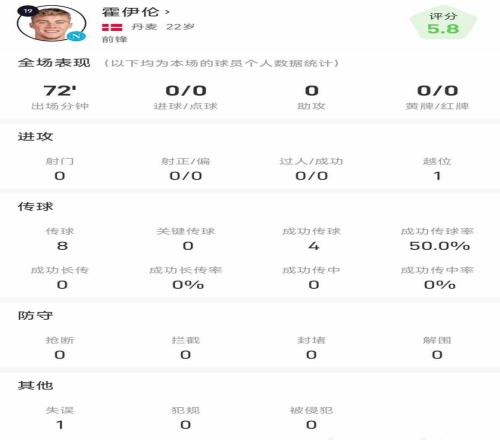 一回曼市就不行霍伊伦1次射门也没有,传球也只有8脚