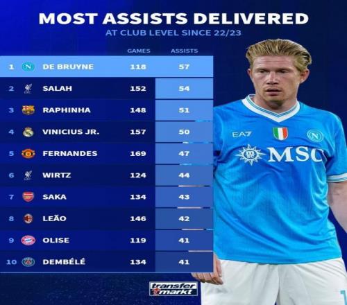 近3年俱乐部各项赛事总助攻榜:德布劳内仍居首,萨拉赫、B费在列