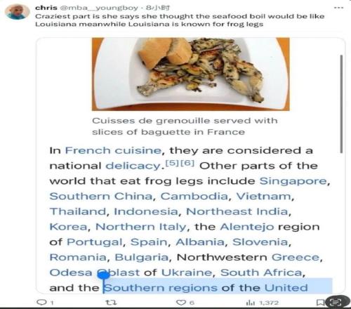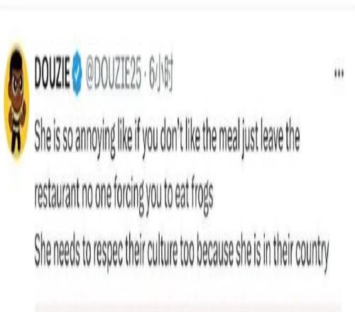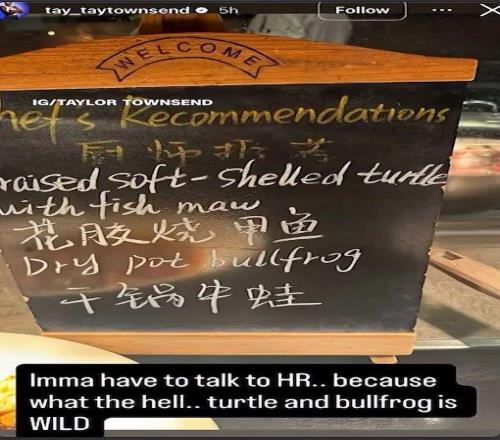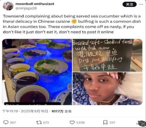 防走丢,大家也可以在“事儿君看世界”找到我 关注起来,以后不“失联”~ 这两天,全球社媒都美国网球女选泰勒·汤森德(Taylor Townsend)的歧视性言论刷屏了…… (泰勒·汤森德) 9月16日,在中国深圳参加比利·简·金杯总决赛的汤森德和队友在下榻的酒店用餐后,立刻到Instagram上发了一系列视频,主要内容就是嘲讽在酒店餐厅看到一些食物。 视频中,她显示指着一盘海参说: “这太疯狂了,我从未近距离看过这样的东西,更不要提吃它了!” (海参) 接着她又对餐厅餐牌上的两款厨师推荐菜,花胶烧甲鱼和干锅牛蛙点评了起来。 (两道推荐菜) 视频里,她一边漫不经心地拨弄着头发,一边挤眉弄眼,表情夸张地说: “老实说,我被今天在餐厅看到的东西震惊了。当我回来后想……这些人绝对就是在杀牛蛙,牛蛙?那不是有毒的吗?那不是一种会让人长疣长疮的东西吗?还有甲鱼?” (汤森德吐槽中餐) “而事实是,它们居然都都辣椒,胡椒,洋葱炖在一起……你可以看到海参就在那里,和面条在一起。我们唯一敢吃的就是那些面条。” “总而言之,我给这顿饭2分(满分10分),因为这实在太疯狂了。” (汤森德自拍吐槽中餐) 整段视频下面,她还配上了一段解说字幕: “我要去跟员工谈谈……这都是些啥啊……甲鱼和牛蛙都是野生动物!” 这段视频可谓槽点满满,哪怕按西方言论的标准,汤森德也精准踩中了“双标”,“种族歧视”,“文化歧视”等一连串雷区。 因此,视频一经发出,没等中国网友跨区来评,Ins上的外国网友便在第一时间出手,直戳汤森德的争议点。 其中一条高赞评论可谓第一时间打了汤森德的脸, “最离谱的是,她说她以为海鲜应该像路易斯安娜的一样,而同时,路易斯安娜以蛙腿料理闻名…” 这位网友还贴出了享誉美国南部的一道法餐: 蒜香黄油煎蛙腿。 (美国路易斯安娜的名菜就有蛙腿) “汤森德抱怨的海参是中餐里的珍馐,牛蛙在亚洲国家也是常见的菜品。这类抱怨相当无礼,不喜欢就别吃,没必要发到网上。” (评论来自推特) “她来自一个校园枪击案呈常态的地方,居然还挑剔食物?” (评论来自推特) “美国人遇到非汉堡薯条时的反应。”