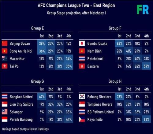雷速体育9月19日宣 亚冠二级联赛首轮,北京国安在主场2-2被越南球队河内公安逼平,没能迎来开门红。目前在E组中,中国香港球队大埔排在第一位,北京国安和河内公安并列第二,澳超的麦克阿瑟垫底。虽然首轮打平,但根据数据网站的计算,北京国安从本小组出线的概率仍有66%。 亚冠二级联赛首轮比赛之后,数据网站对各队的出线概率进行了计算,北京国安的晋级概率为66%,在东亚区所有球队中排名第5,在本小组中排名第一。虽然没能拿到开门红,但北京国安的实力在本小组中还是较为突出的,得到了数据网站的认可。 其他的球队中,韩国的浦项铁人出线的概率最高,达到93%;泰国的曼谷联排名第二,概率为88%;日本球队大阪钢巴以87%的晋级概率排在第三位;第四位是越南球队南定绿钢,晋级概率为67%。 |