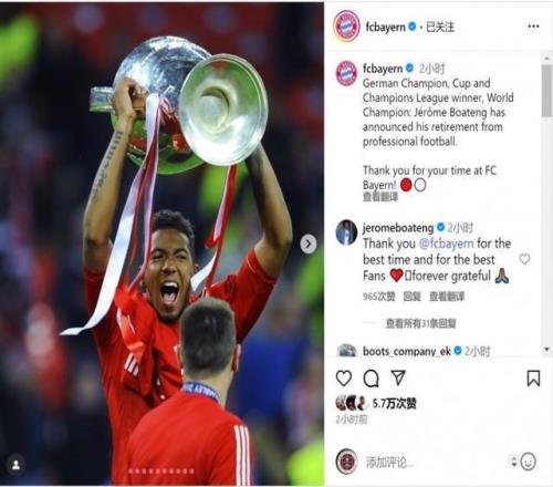 博阿滕宣布退役拜仁社媒晒照致敬:感谢你在拜仁的时光