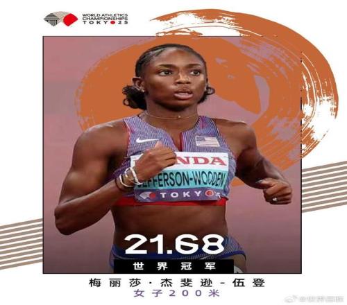 女子200米:杰斐逊-伍登21秒68夺冠,成为本届世锦赛双金王