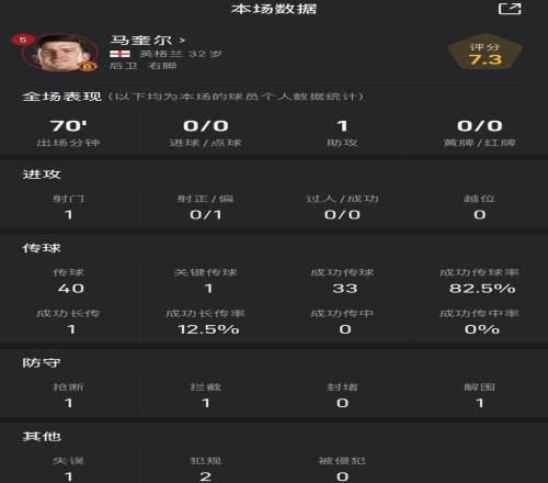 马奎尔数据:里程碑之夜送助攻,传球成功率82.5%